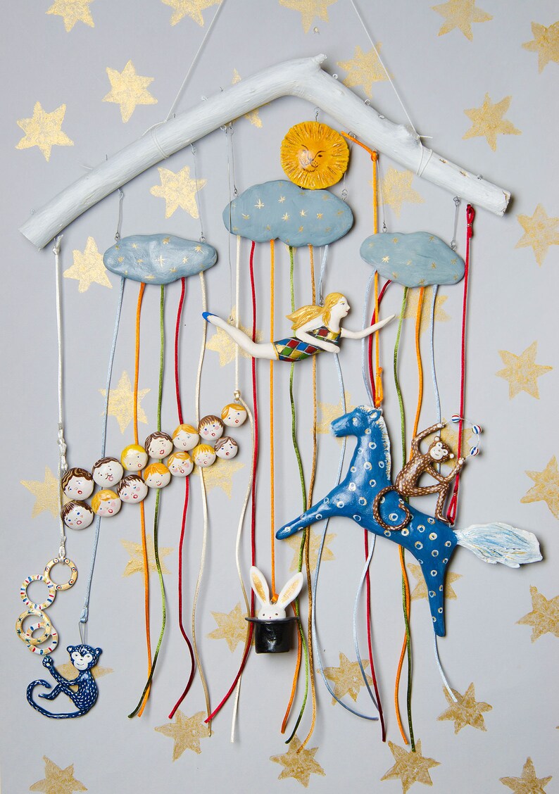 Mobile Circus Wall Art Decoratoins Acrobat Sculpture Clay Figures On Natural Branch Circus Hanging Decoration 39x53 Cm